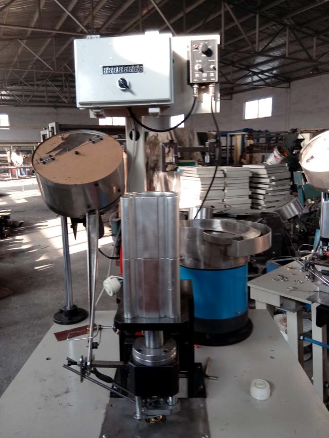 4.根據(jù)生產(chǎn)要求把相應(yīng)的紐扣或雞眼倒入打扣機(jī)臺(tái)面上的左右槽內(nèi),打開(kāi)電源開(kāi)關(guān),讓打扣機(jī)通電。